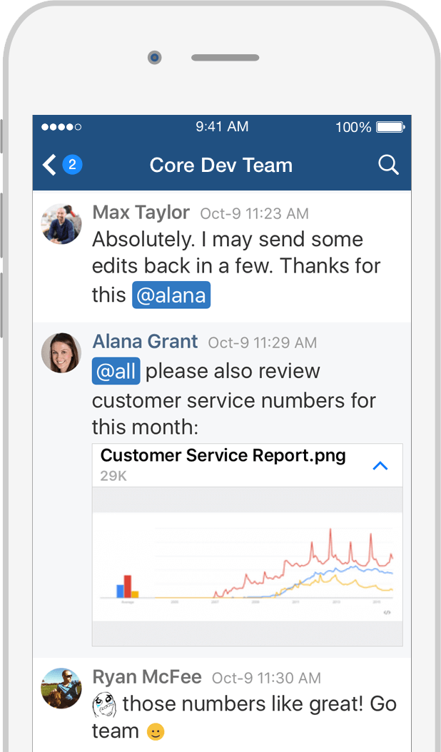 采用一对一交谈的方式或者在私人和公共聊天室内集中进行沟通。为特定项目、团队甚至是下班后的闪避球比赛创建聊天。